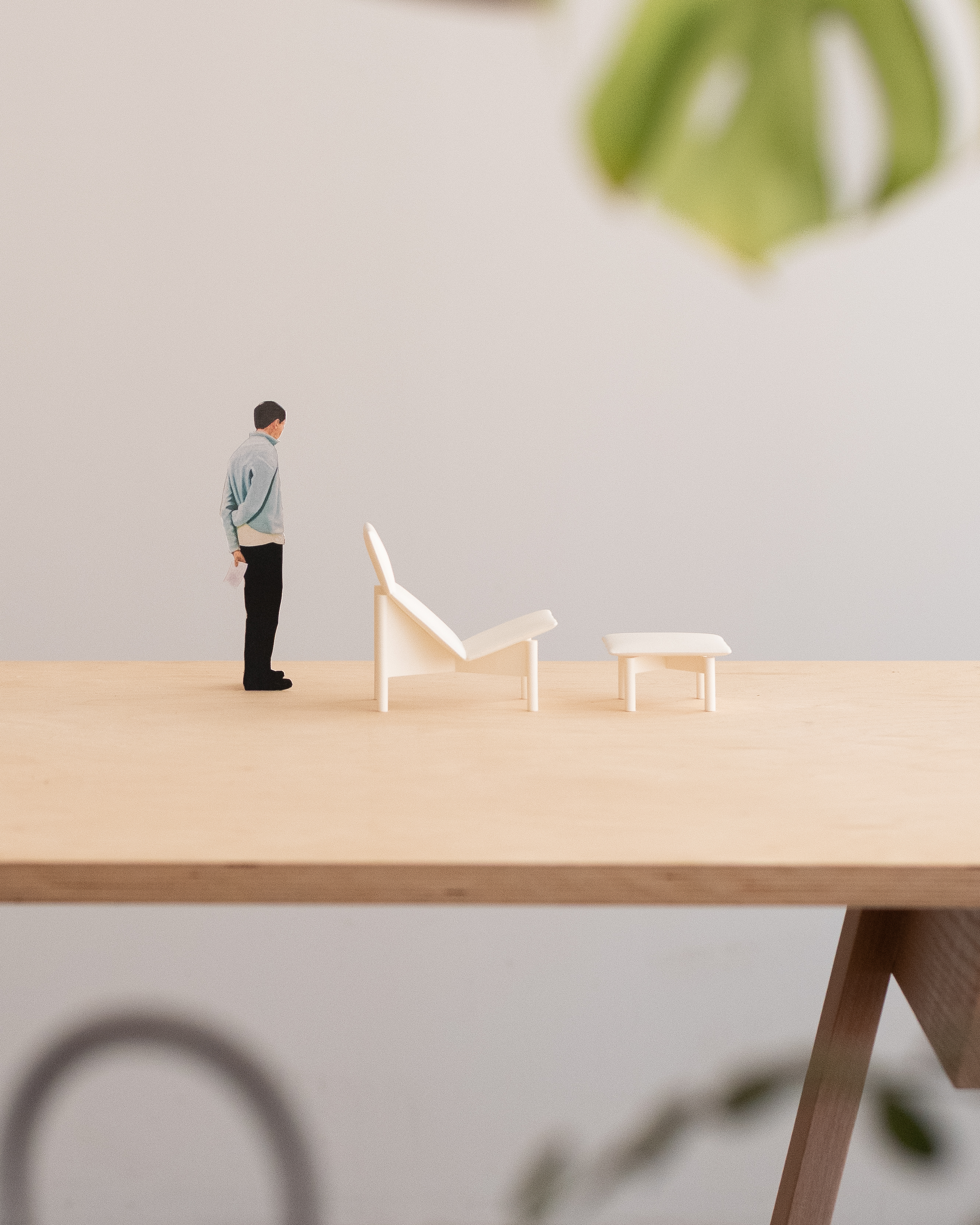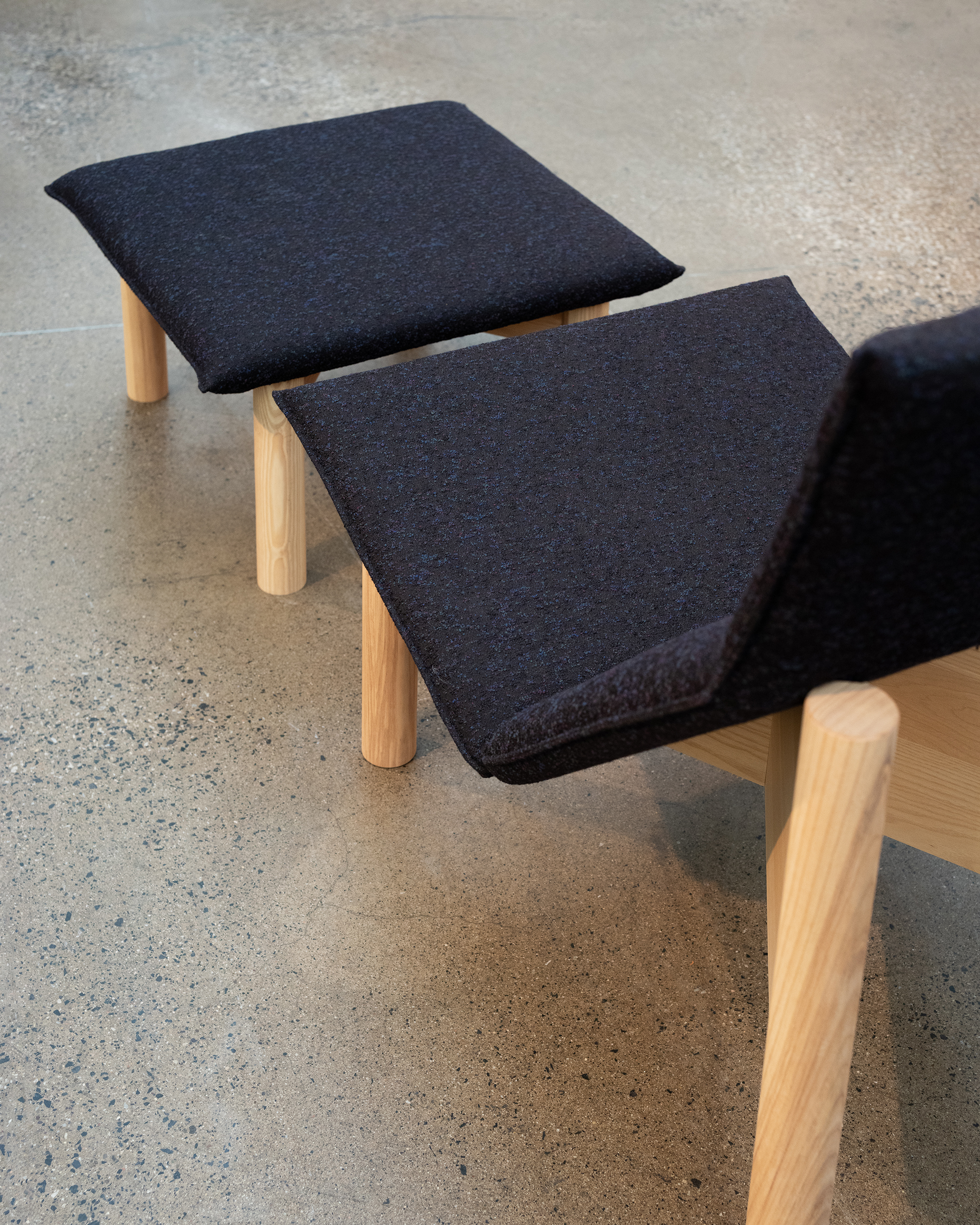 The chair’s simple gestures are reflected in its form. Upholstered elements, understated and rectilinear, create a sense of clarity while maintaining softness. These connect seamlessly to solid wood supports, resulting in a lounge chair that feels welcoming.