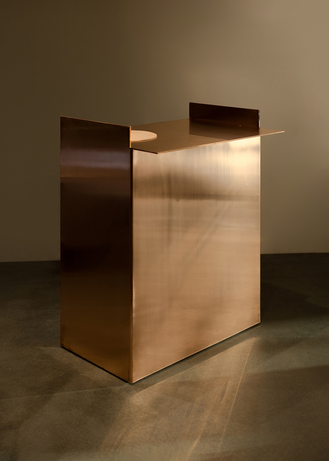 The Copper Bar Cart was designed for EQ3 during the Highpoint Furniture Market that takes place twice a year. The brushed copper plated steel cart rests on four castors, allowing for portability during events.