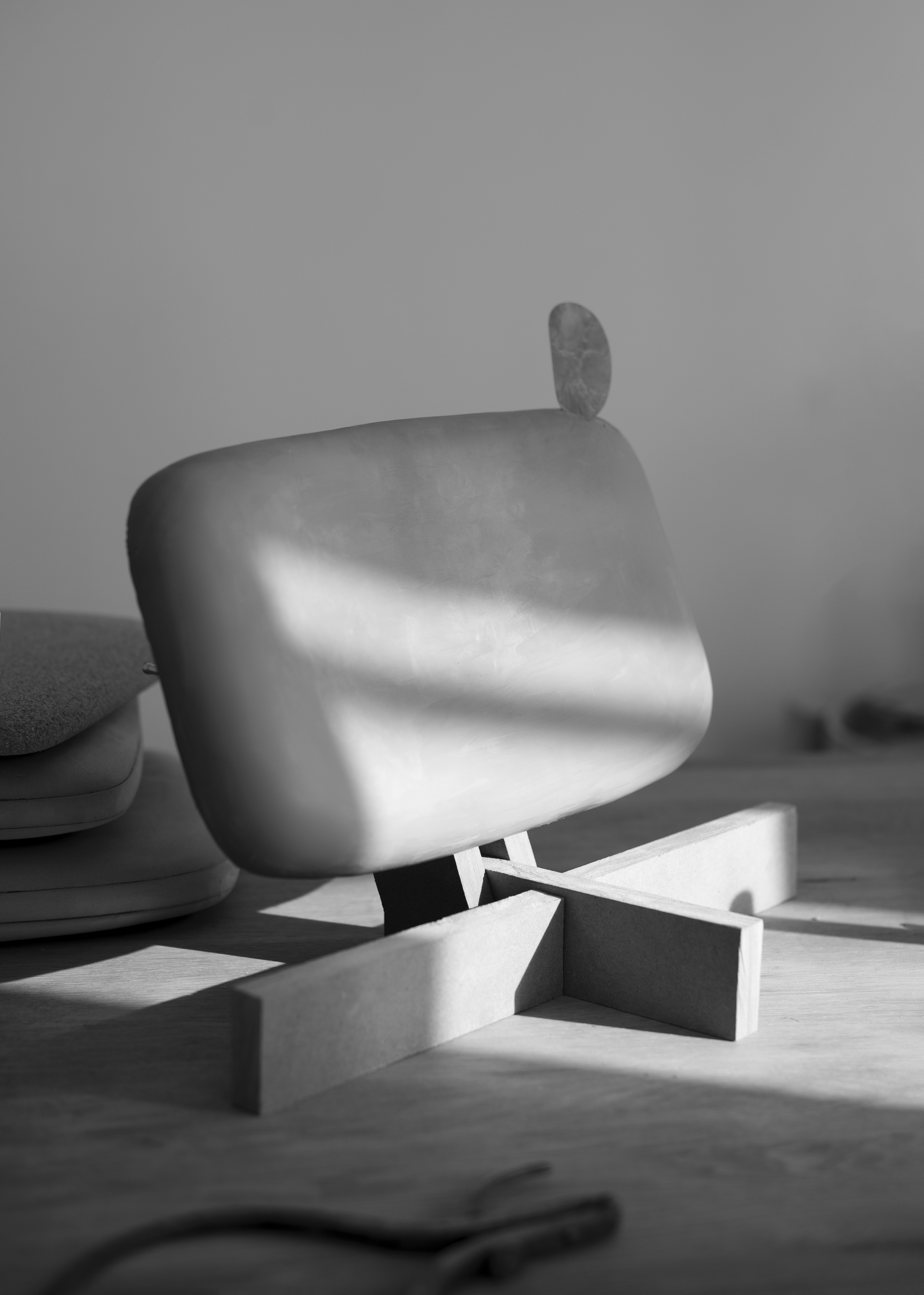 The design process was a combination of both old techniques and new technology. Once the general idea and forms were discovered through drawings, time was spent sanding the seat and backrest forms out of rigid foam. Further refinements of each form came from the use of automotive clay - a long and difficult process of sculpting an oil-based clay over a mdf framework to further refine the complex curves of the backrest. The clay model and foam forms were then 3D scanned and cnc’d from a block of cork. These cork models are more resilient and were used to test the seating experience and final composition.