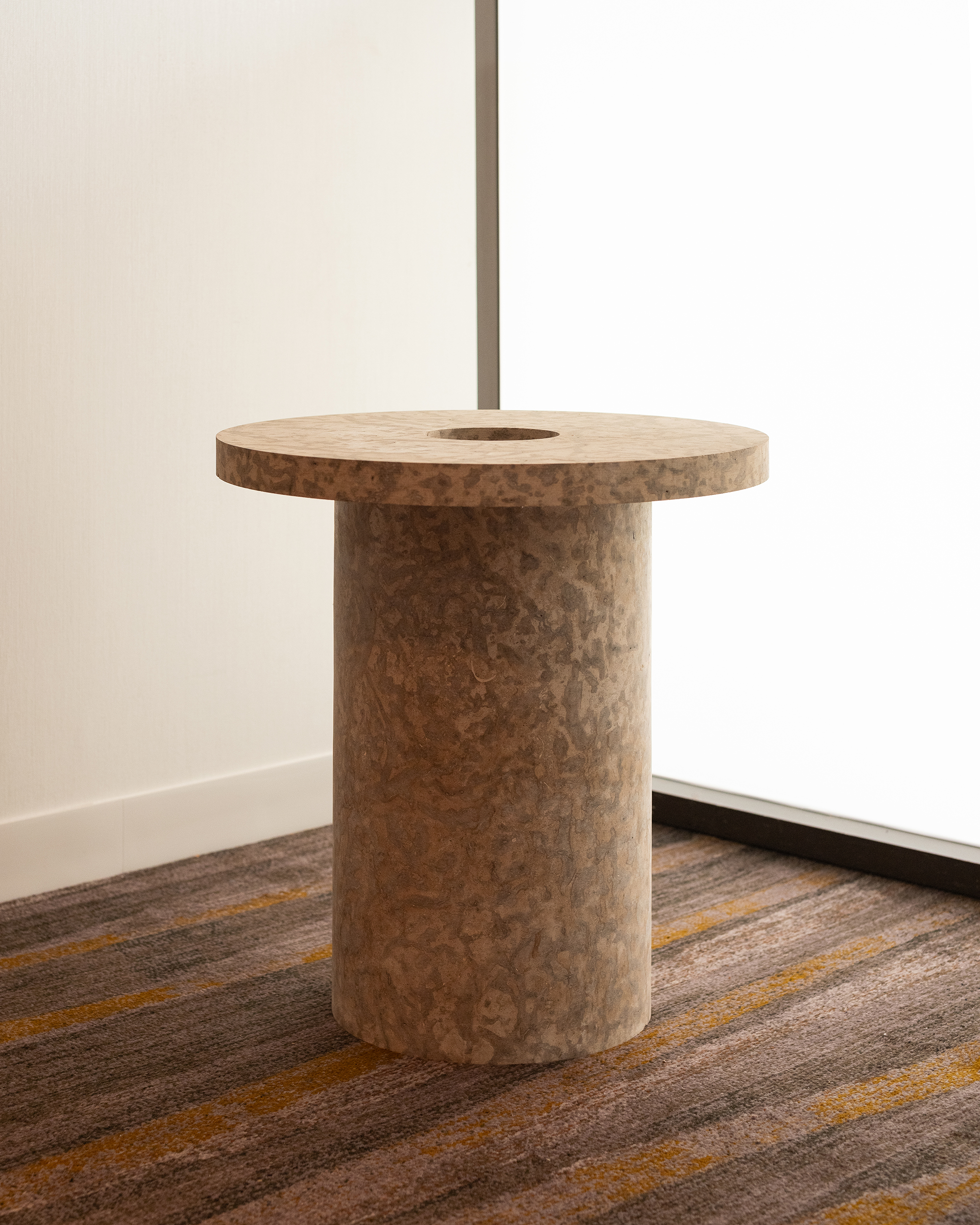 Commissioned by the Government of Canada for the 2025 G7 Summit in Kananaskis, AB, this collection of stone furniture highlights the raw beauty of Canadian materials and craftsmanship. The two identical 1400lb tables are carved from solid Tyndall stone, their expressive surfaces showcasing the material’s rich fossil patterns. A matching side table features a carved recess at its center, allowing it to function as both a table and a vessel. Quarried in Manitoba, Tyndall stone’s natural markings remain the focal point, grounding each piece in the material’s geological history while serving a contemporary purpose.