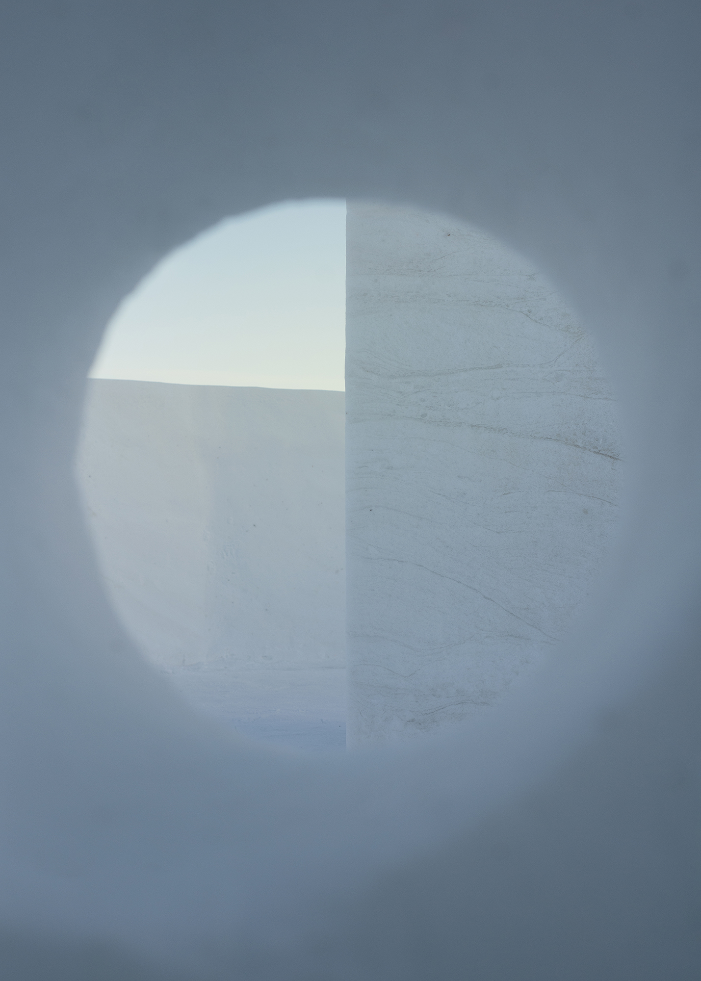 Strategically placed carved portholes frame the frozen views, creating a 'looking through' experience that connects viewers to the immediate surroundings while expanding their perception of the snow-covered landscape. The central, largest porthole acts as a bold frame for interior views and a playful bench, inviting visitors to sit and enjoy the panoramic scenes. Inspired by Koop's distinctive painting style, NIX becomes an immersive celebration of the subtle beauty of snow, seamlessly blending art with the natural environment.