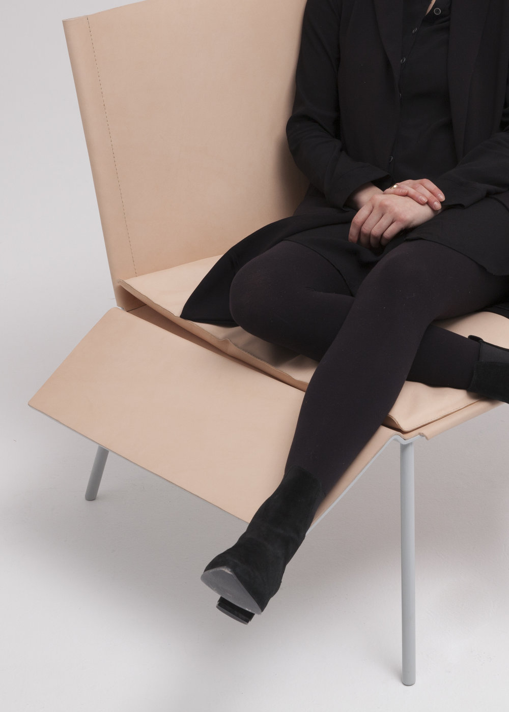 The Saddle Chair is a new typology of chair for the home. The two saddle leather backs offer multiple methods of sitting and interacting with the chair; the lounge seating position with leg rest allows for a relaxing reclined seat, while the adjacent side allows for a casual seating position similar to that of a typical easy chair. The sculptural form and thin profile are the result of fusing a light steel structure with a vegetable tanned saddle leather. The seat, a down filled and upholstered leather cushion, is deep enough to find comfort between the two adjoined back rests. Over time the leather will patina, leaving traces of preferred lounging and seating positions, highlighting the habitual act of sitting.