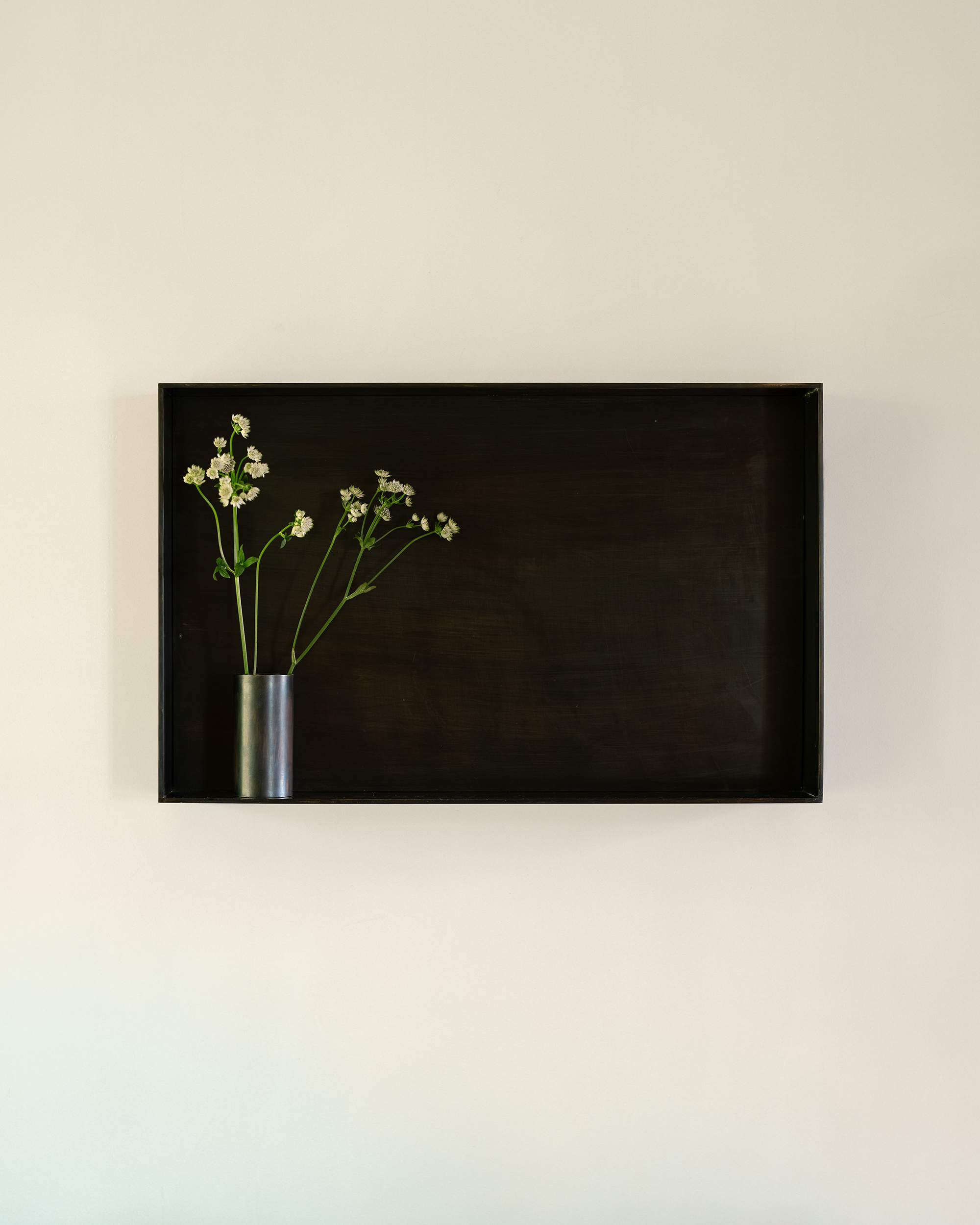 Conceived as a frame for arranging flowers and vegetation . The solid blackened brass frame passively reflects the surrounding space, its acid-treated surface shifting between blue, brown, and green hues reflected from the surrounding tones of the space. The frame can be mounted in either a portrait or landscape orientation depending on the arrangement or size of the space.