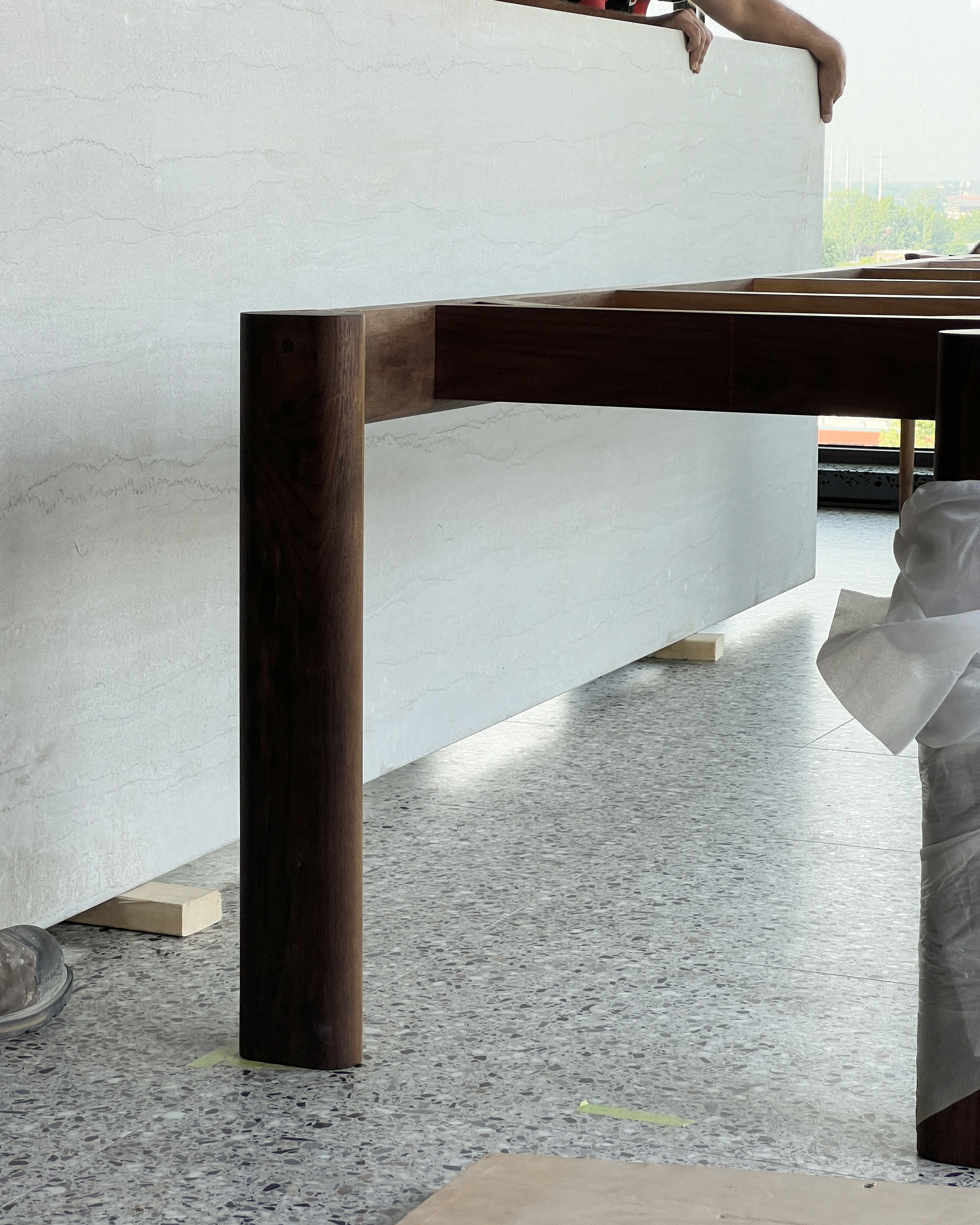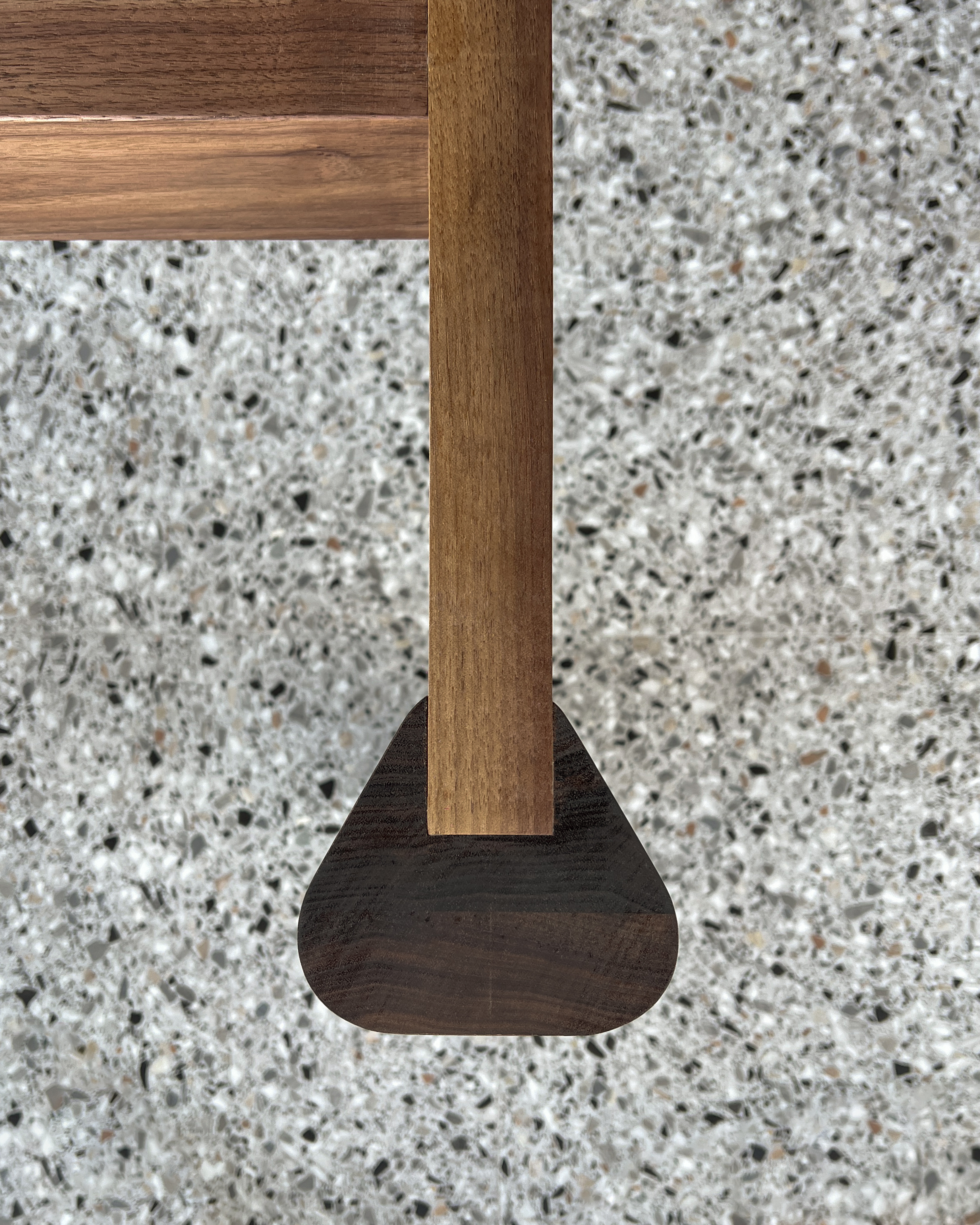 Wild vein cut stone topping a gentle solid walnut base. Shown here in solid walnut.